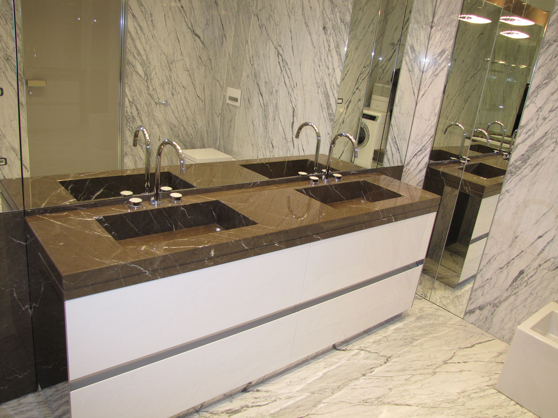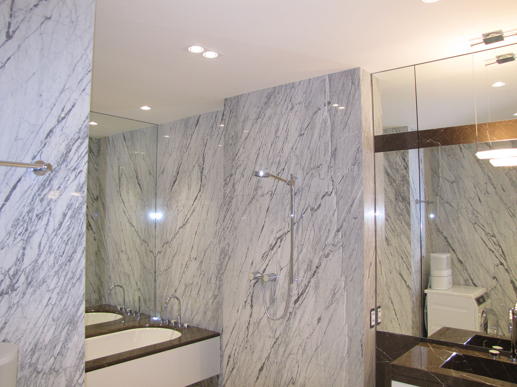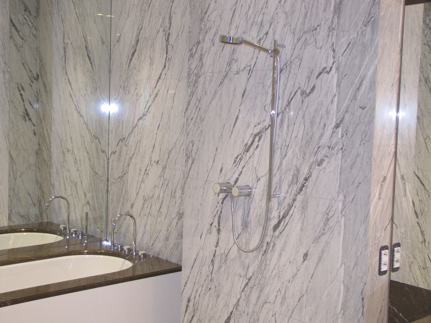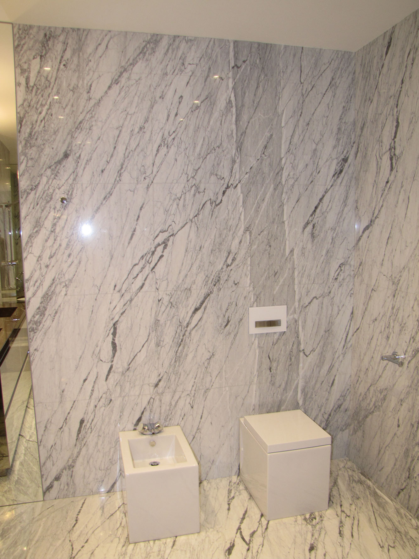 Ванная комната, выполненная в светлых мраморных тонах, выглядит элегантно и сдержано, предоставляя широкие возможности для воплощения различных идей в оформлении интерьера. Кроме того, при необходимости может быть сделана ее перепланировка для более рационального размещения сантехнического оборудования и удобного использования полезного пространства.