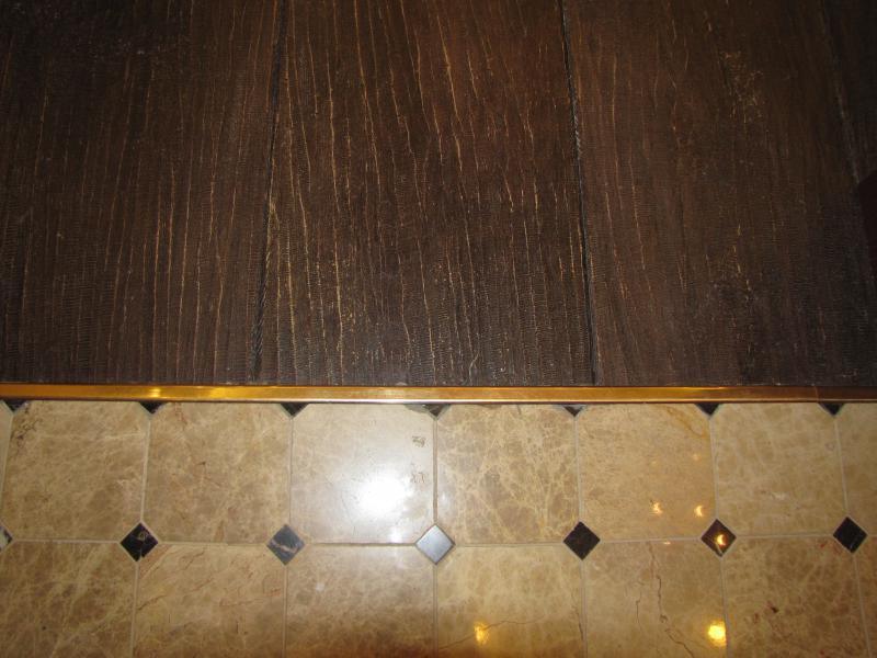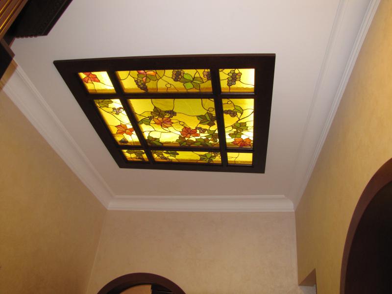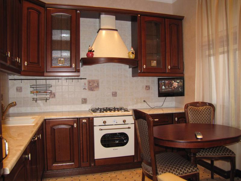 В кухне темные предметы мебели хорошо контрастируют с яркой отделкой стен. В рабочей зоне был использован мелкий кафель светлых тонов. Особого внимания заслуживает вытяжка, которая не выделяется среди прочих деталей интерьера, поскольку является встроенной в настенные шкафчики конструкцией.