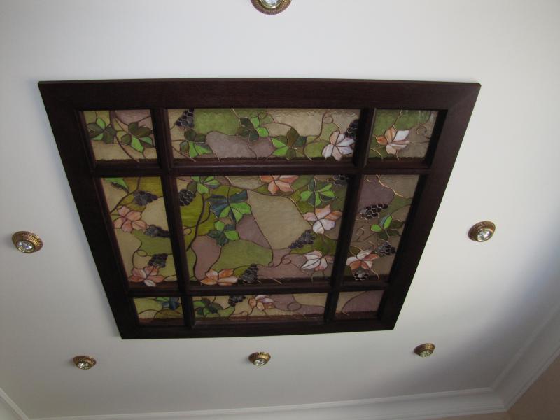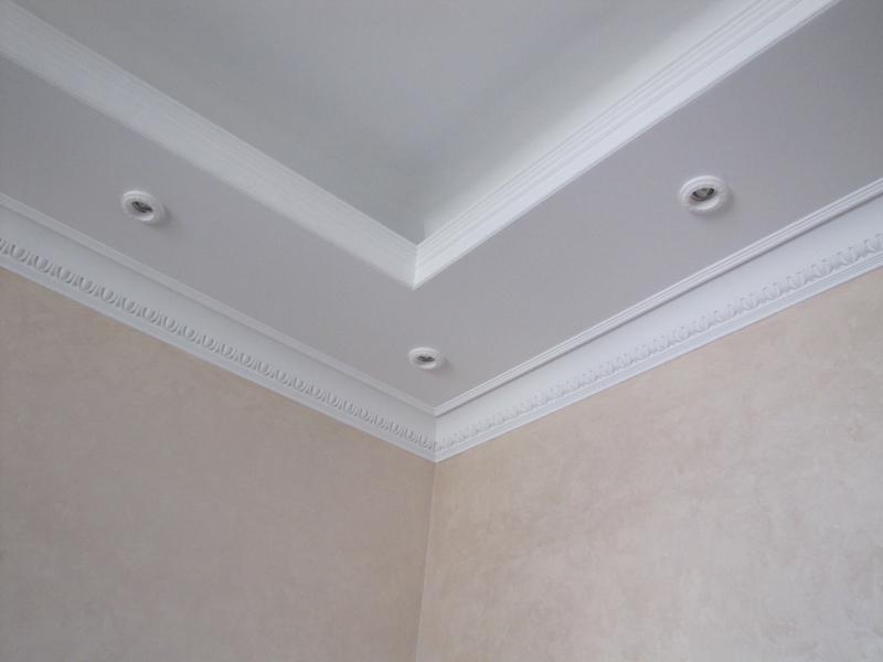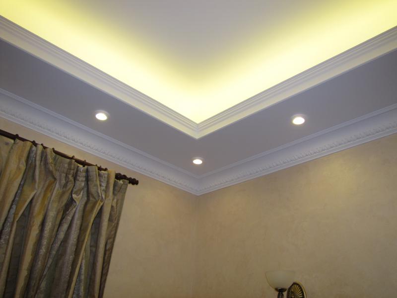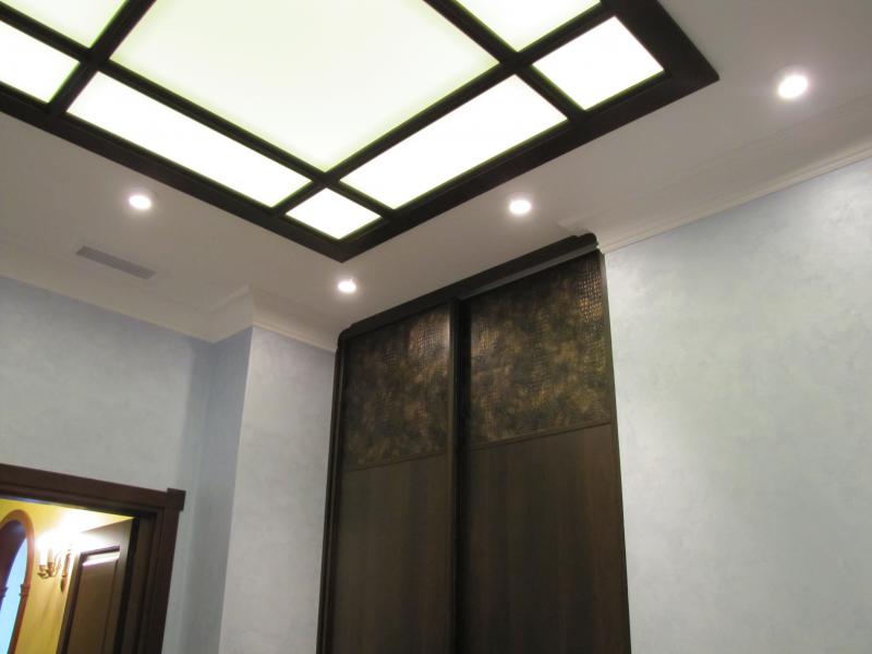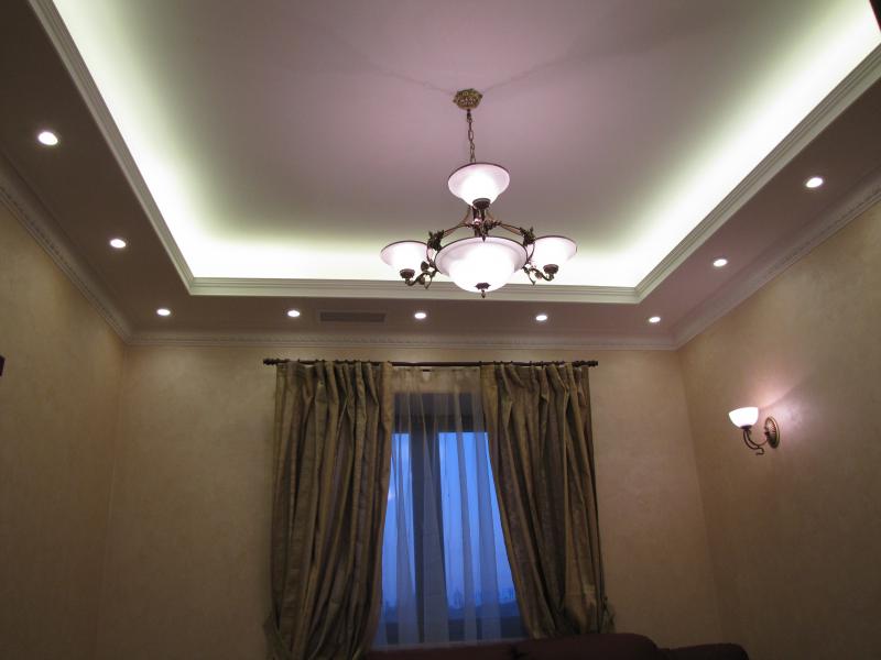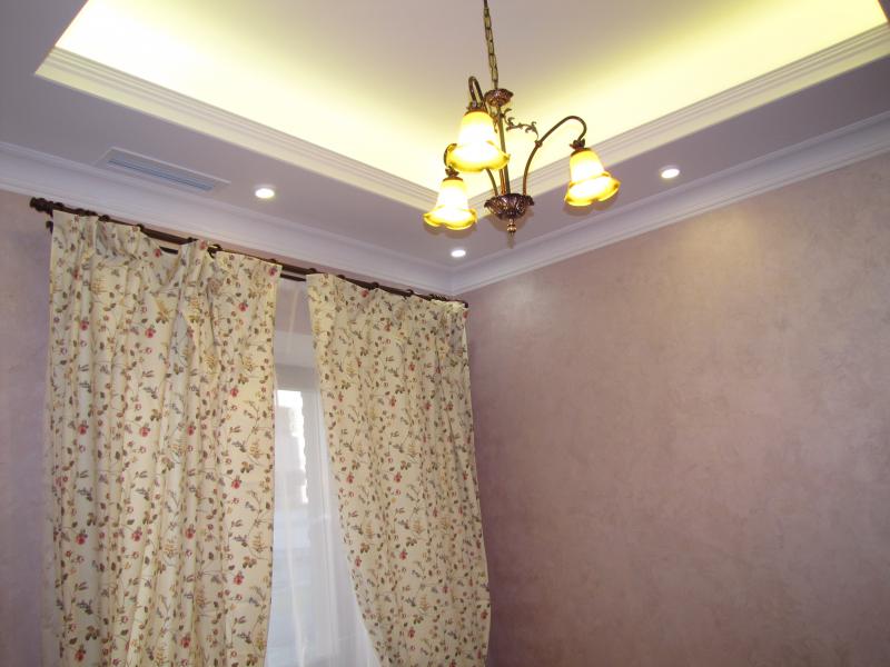 В комнатах присутствуют двухуровневые подвесные потолки с встроенными по всему периметру точечными светильниками. Они идеально сочетаются со светлыми стенами и удачно подобранным текстилем.