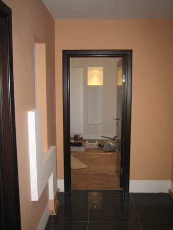 Отделка помещений проводилась в светлых лаконичных тонах, которые гармонично контрастируют с темными цветами межкомнатных дверей. С помощью гипсокартона были оборудованы функциональные ниши и другие дополнительные элементы. Красивые арочные полки теперь можно использовать для размещения семейных фотографий или мелких предметов декора.