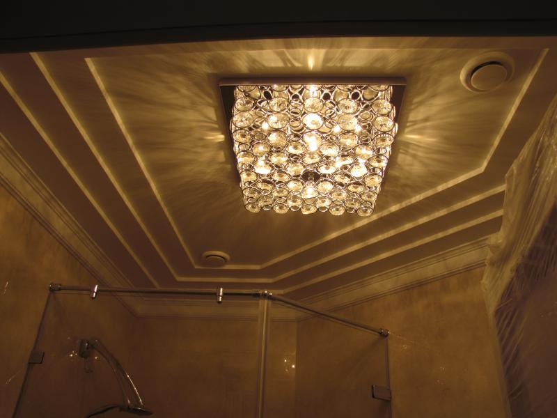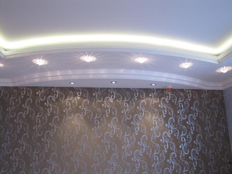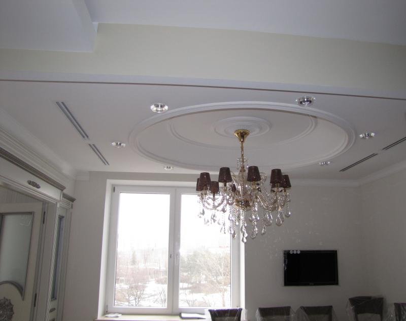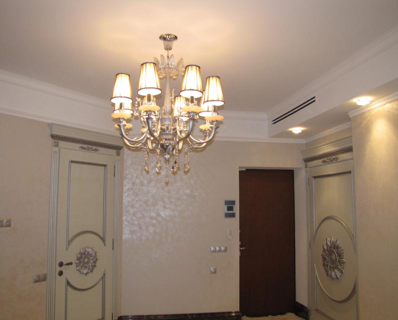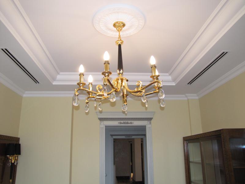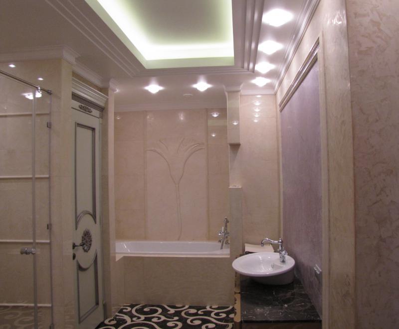 В комнатах установлены двухуровневые натяжные потолки. Данные конструкции не только эстетично смотрятся в условиях современного интерьера, но и позволяют скрыть из поля зрения различные элементы коммуникаций. При этом одни помещения освещаются с помощью точечных светильников, равномерно распределяющих световые потоки, а в других используются подвесные люстры.