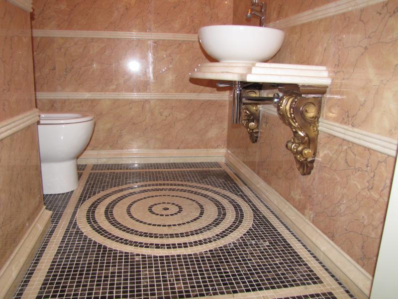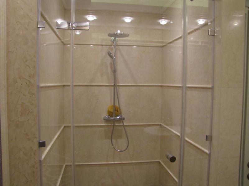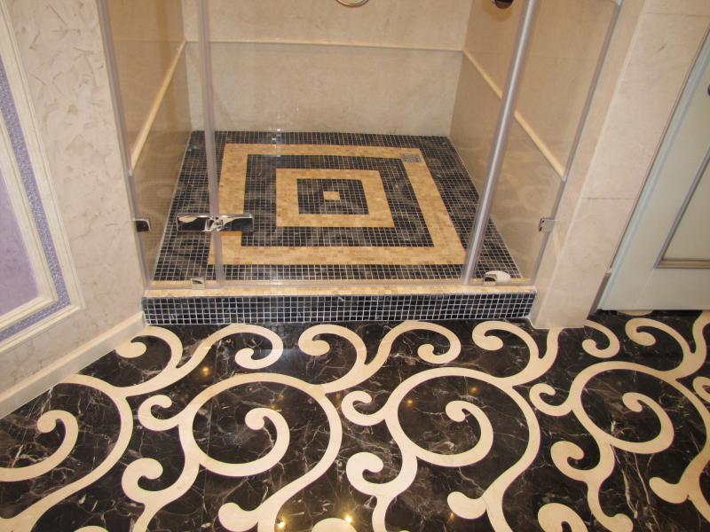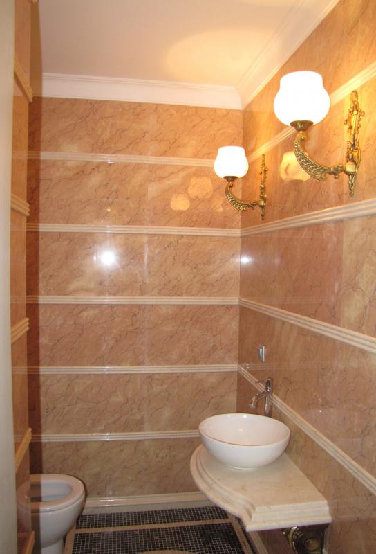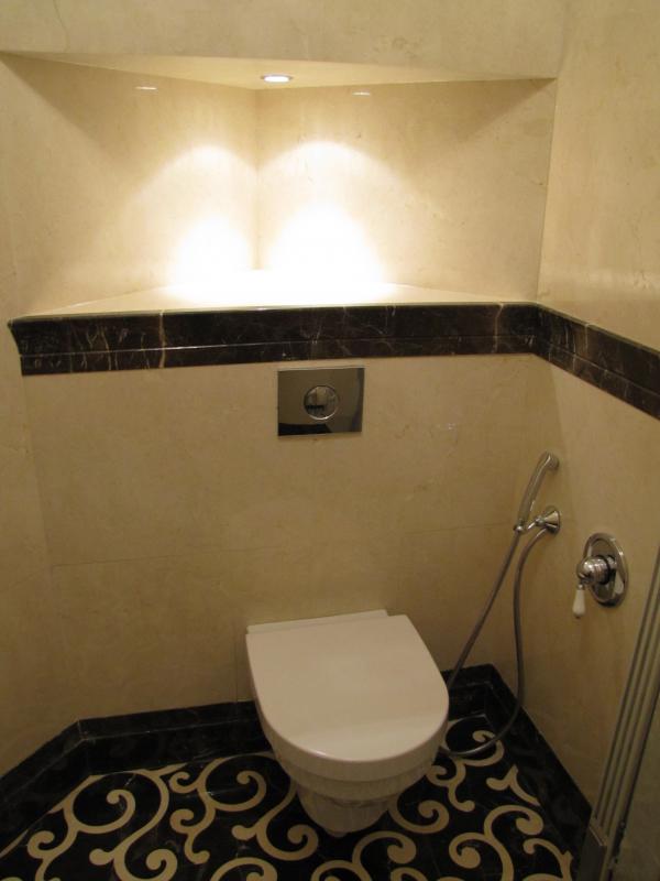Санузел полностью выполнен из плитки разных цветов, на фоне которой идеально смотрится современное сантехническое оборудование. Душевая кабина с прозрачными дверьми вмонтирована в специальную нишу, благодаря чему в помещении остается достаточно места для свободного передвижения.