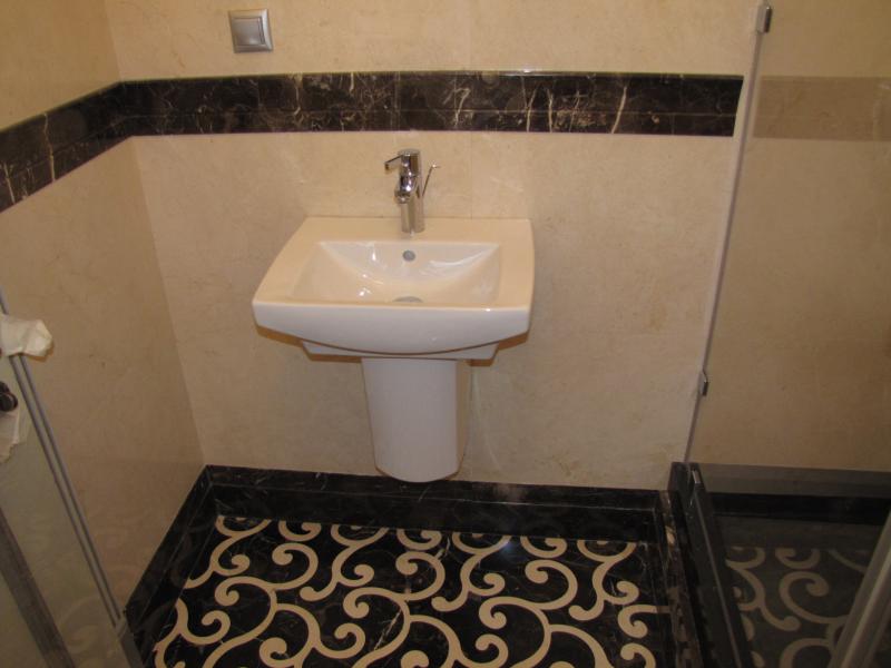 Отличительной особенностью ремонта данного объекта стали оригинальные узоры напольных покрытий, гармонично дополняющие общий интерьер помещений. Если обратить внимание, например, на фотографии санузла, то можно увидеть, что именно пол задает необходимый контраст, оживляя комнату и делая ее более элегантной. В гостиной и спальне, наоборот, были использованы однотонные материалы для пола, благодаря которым помещения выглядят строго и лаконично.
